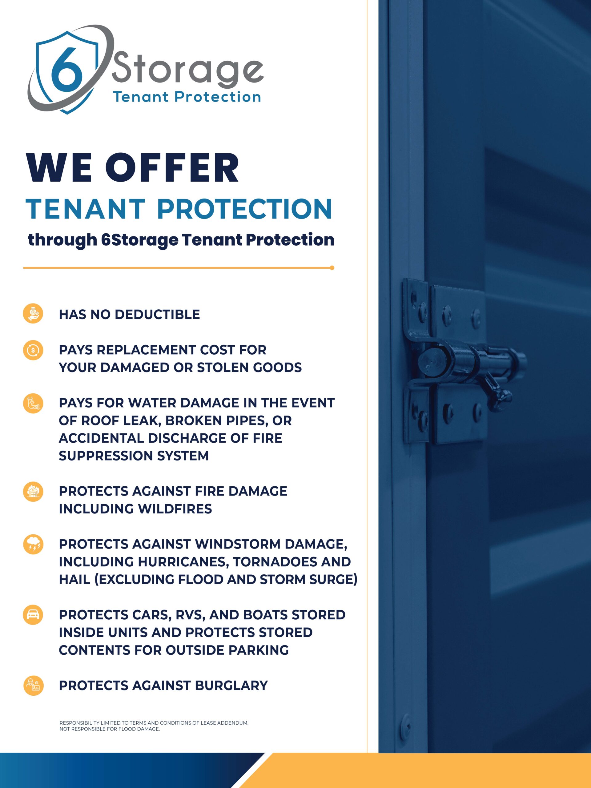 Insert copy here. This protection plan through 6Storage protects against fire, water, and storm damage (excluding flooding and storm surges).
